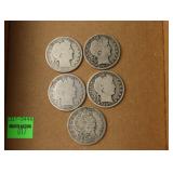 (5) Barber Half Dollars 1905-S, 1906, 1907-O, 1912-D, 1906-O
