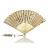 - 2021 ANTIQUE CHINESE HAND CARVED IVORY 14K GOLD & 800 SILVER APPLIQUE SILK FAN WITH LACQUER BOX