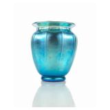 - 2425 STEUBEN BLUE AURENE IRIDESCENT RIBBED GLASS VASE