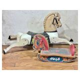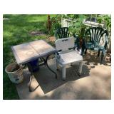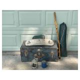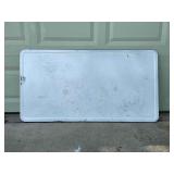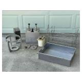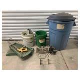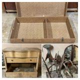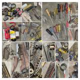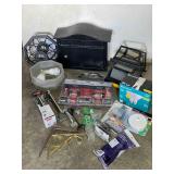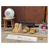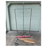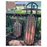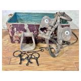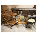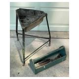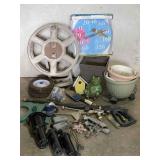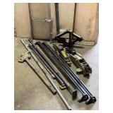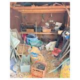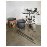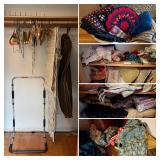 510 Vintage Metal Garden Cute vintage lawn and garden decor includes a black wrought iron horse and buggy weather vein, a cat paw planter, a painted floral bucket, an enamel bucket with wood handle and some rust, a wind chime that needs restrung, a metal urn or gravesite flower pot, and some stakes. 511 American Flags & Poles Group of three flagpoles, one with large flag attached, and another folded flag with eagle adornment. 512 Lawn & Garden Includes a plastic Suncast wall mounted garden hose reel, an EZRead 12.5” outdoor thermometer, plastic garden pots, a three wheel plant caddy, a variety of sprinklers and hose attachments, and more. 513 Bird Feeder Wooden wild bird feeder with a 1x4 for attachment to a structure, and has all the working parts including vintage black metal hinged roof, a mock chimney handle, plexiglass, claw rests, and a latch. 514 Home & Auto Cleaning Tools Includes two 3200 lumen, 4’ , LED shop lights, Suncast Steelcore plastic snow shovel, an ice scraper and brush, an OCedar sponge mop, a Libman dust mop, and a Swiffer wet mop. 515 Vintage Saw This two man crosscut saw measures a whopping 72” from end to end. Wood handles are in good shape, and there are patches of rust. Solid and sturdy vintage condition. 516 Primitive Farm Tools A vintage scythe has a 20” blade with hand grip. The bottom or end of the wood handle has broken off, and the wood grip is cracking in some spots. The blade feels loose on the wooden base. A hand sickle with wood handle, has some rust forming on one side of blade, marked Rock River Works. A 65” Cavex thatching rake with 20 teeth is in great vintage condition. 517 The Scarecrow Cute Halloween or autumn decor features a scarecrow on a garden stake, styrofoam pumpkin head, with a burlap and plaid outfit, and straw body. Measures 52” tall. 518 Vintage Croquet Set This wooden six player croquet set has mallets, balls, and stakes with stand. The wood and paint has weathered with time. 519 Snowman Yard Decor A metal painted snowman looks to be made from a wavy pattern barn or roofing tin, with 3D like elements, hat, scarf, glove, and carrot nose. There is a pole base on the back that can be folded in for storage. 520 Christmas Yard Art Pair of home made Christmas snowman and woman made from some type of hard pressed board, hand painted, with a textured glistening snow appearance. The top hat needs to be reattached. There are some holes and appears that it may have once been attached to something. 521 Louisville & Watling Ladders Includes a 6’ Louisville fiberglass ladder, mostly covered in paint, and a vintage 4’ Watling wooden ladder. Both ladder hinges open smoothly and hold sturdy. 522 Vintage Picture Frames Large group of vintage picture frames in a variety of sizes and materials including wood, wood and cloth material, painted wood, and brass like metal frames. There are two very large frames, a box of large and medium frames, and a box of small and round frames. 523 Vintage Floor Lamps Pair of beautiful ornately detailed vintage electric floor lamps that need rewired. Constructed out of brass or bronze or iron or metal material. One of them has a crack toward the base. The other has a broken piece toward the base. 524 Electric Heat & Air Group of three electric items includes an Intertek heater, model DF1511-A, a vintage blower or fan, and a retractable extension cord reel. All items power on. 525 Virtue Stacking Chairs Group of 12 mocha brown metal and vinyl stacking chairs produced by Virtue of California, model (89041). Chairs are used and in fair condition showing signs of wear, scratches, tears, and stains. 526 Vintage Folding Chairs Group of three vintage webbed beach or lawn aluminum frame folding chairs. Plastic armrest have some scratches and scuffs, as does the frame. All webbing is intact with no rips or tears. Good vintage condition. 527 Camping Trunk & Gear An old trunk and camping gear includes trunk that is a little beat up, however still latches and has a handle, a bag of handy tent or canopy poles, a walking stick, an Admiral Blackie’s Brand flotation device, a Stanley mug, and more. 528 Cosco Three Step Work Ladder Cosco 5’ tri step work or painting ladder features a heavy duty tubular metal frame, plastic steps, and stabilizing feet. There is also a tray or attachment that holds tools, supplies, and a paint can. All hinges open smooth and lock. Ladder folds up tight for storage. 529 Milk Crates Roughly 16 milk crates, two bottle crates and a restaurant style dishwasher rack. ** Items have been added after the photo 530 Aluminum Extension Ladder An 11 or 22 step aluminum step ladder. Brand unknown. Ladder has not been extended and tested for use. Shown laid against attic stairs for pictures. Aluminum ladder only. 531 Vintage Metal Cart & Toolbox Vintage metal rolling cart or planter with plastic triangle tub. Metal base is intact and sturdy, and plastic tub is cracked and worn. Also included is a metal toolbox with some cool vintage and antique tools. 532 Hand Truck 52” heavy dury industrial blue hand truck or dollie, unmarked. Paint is chipping and some rust on various parts. 533 Metal Display Rack Three tier metal collapsible or fold up retail specialty display rack with soda pop bottle design on both sides. Some signs of wear and minimal rust. Solid and sturdy rack. Measures 19.5” x 14.5” x 56”. 533a Blank Canvases Group of five canvases, one extra large measures (36” x 48”), large measures (24” x 36”), one medium measures (20” x 24”), and two small measures (12” x 16”). 534 Group Of Vacuums Includes seven different vacuums for all types of sweeping, including a Hoover Floormate wash, and dry vacuum (model FH40010B), two Oreck XL Xtended Life vintage vacuums, (gray model U2640RHPK) and (white model RXL2600HH), Bissell Little Green multi purpose cleaning machine (model 1400-7), a Monster Euroflex handheld vacuum, missing tip (model H057). a Black & Decker Dustbuster (model C