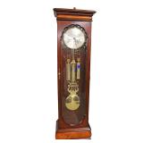 WK Sessions, grandfather clock working made in Germany, mahogany and burl walnut case with beveled glass, keys, weights and pendulum |