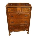 Antique walnut two tone 6 drawer high chest with applied carving |