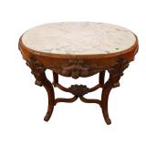 Antique highly carved oval marble top Victorian parlor table in the oak and walnut woods with shell carved stretcher base |