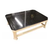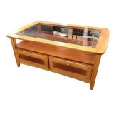 Contemporary bevel glass top coffee table in the maple finish, 2 drawers |