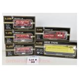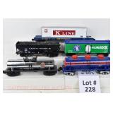 32 K-Line New OB: K-90014 BN Aluminum Tanker, 90008PC Flexi-Flow Hopper, K-90009 CB&Q Stock Car, K-90010 SF Reefer, K-900071C 1995 KCC Timken Boxcar, K-94455 MGB Soft Top/Slumber Coach, K-94426 MGB Soft Top/Caravan