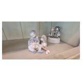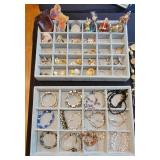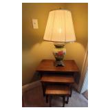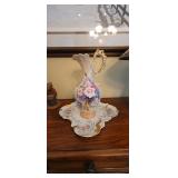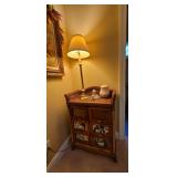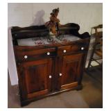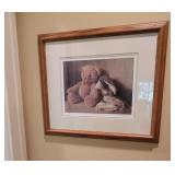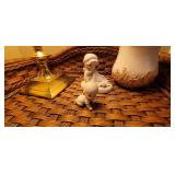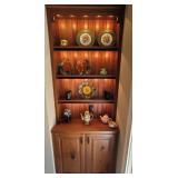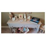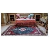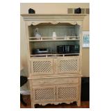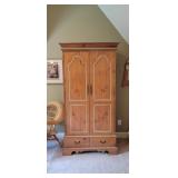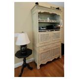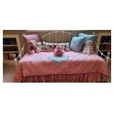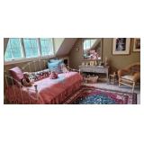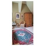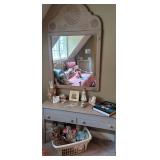 White trundle bed, Lane armoire collection, quilts, afghans, teddy bears, dolls, large wooden mirror, wicker chair Basement