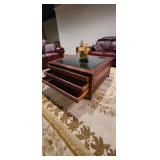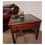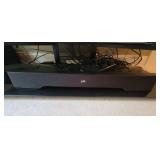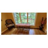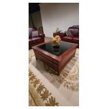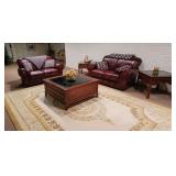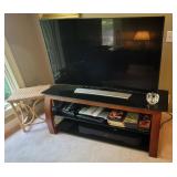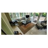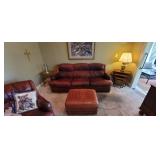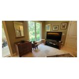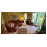 Brown leather chair and ottoman, Brown leather couch, wood/glass/metal side table, Samsung 55 Curved TV, Samsung DVD player, Polk soundbar, Nesting Tables, wood chest/ dresser Sun room