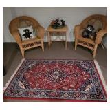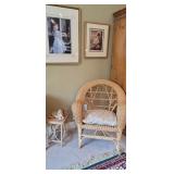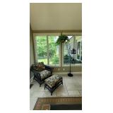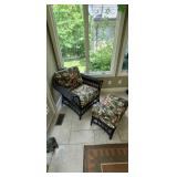 Black wicker chair with ottoman/ coffee table/ end table, tan leather love seat, Samsung monitor Bedroom
