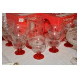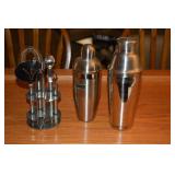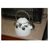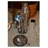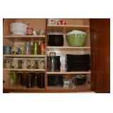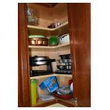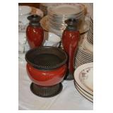 Kitchen Mikasa Desertbloom dinnerware Partylite candle holders Wilton Armetale pewter plates Wrought iron 6 bottle wine rack Cosco footstool Stainless steel barware utensils Pampered Chef cooking and baking items My Perfect Kitchen pasta machine Assorted pots, pans and bakeware Assorted colorful vases Waring beehive style blender Hamilton Beach counter toaster oven Pyrex ovenware Assorted beer, wine, margarita and martini glasses