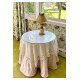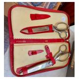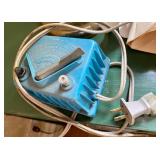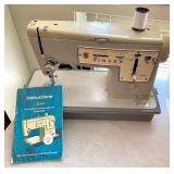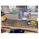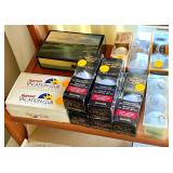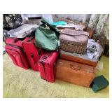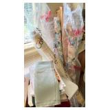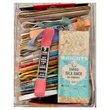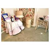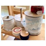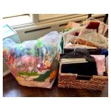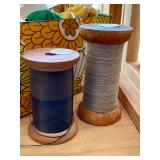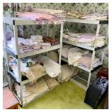 Linens · Vintage Lace Tablecloths · Lace Napkins and Doilies · Bedding, Bedspreads, Comforters, Sheets, Pillowcases · Vintage Danella Danish Hand Crank Rug Hooking Tufting Tool · Singer Stylist Zig Zag Sewing Machine Model 457 · Collection of Threads, Buttons, and Notions · Spools of Lace and RIbbon · Tiny Tailor Mending Machine by Singer · Vintage Sewing Patterns, Simplicity · Bolts of Upholstery Vintage Fabrics · Body Form · Yarn, Patches, and Fabric Remnants · Sewing Supplies, Scissors, Measuring Tools