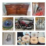 It's another enticing multi-estate auction in Ashland, VA! You'll find framed artwork - signed and numbered prints, lithographs, original paintings, 3 project Honda motorcycles, aluminum wheelchair ramp, solid wood furnishings by Ethan Allen, Haverty's, vintage MCM Mersman, American Drew, as well as un-marked antique and marble-topped pieces. Glittering gold jewelry, collectible currency, boxed ammo, vintage vinyl records, power tools, and MORE! Email questions@ctbidsrva.com to preview!