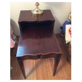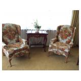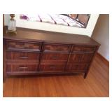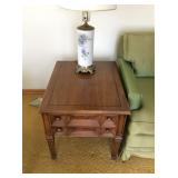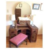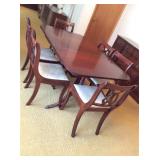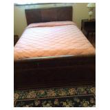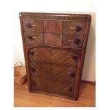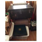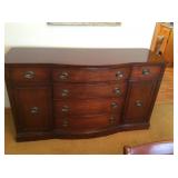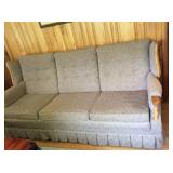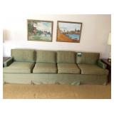 Furniture: Mid century modern furniture Pullman Fine Living Room Furniture green sofa "L" Shaped modern table Mid century modern king bed room suite with bed, dresser, pair night stands & lamps Modern card table with four folding wood chairs Pair 1970s wingback chairs, pair end tables and Octangular end table Antique one drawer work Table Mahogany dining room drop leaf table with one leaf and six lyre back chairs Mahogany serpentine front buffet Mahogany three drawer cedar lined chest Waterfall depression era full bed with chest, vanity dresser, with stool Waterfall depression era desk with chair Mid century modern Round kitchen table, leaf, four swivel chairs Tall corner cabinet with one drawer and top glass doors Set of three needlepoint seat Walnut dining room chairs RCA Victor wood cabinet stereo Colonial style sofa and matching chair Barnhardt three drawer chest with inlaid top Queen Anne style wood card table with one drawer Orange rocker recliner Two sets of TV trays with holder Antique church pew Antique small wood trunk Flatware Silver chest on legs Pair of glass top wood end tables Two drawer metal file cabinet with key Old green trunk with inside tray GE white stacking washer and dryer Morse Push button zigzag sewing machine in wood cabinet With storage stool Padded headboard full-size bed Mid Century Modern Furniture