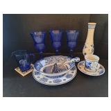 - Lot #54 - Staffordshire Liberty Blue Plate, Three Vintage Martha Washington Blue Fostoria Cameo Glasses, Delft Blue Vase & More