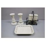 Longaberger Salt And Pepper With Wrought Iron Carrier, Candle Sticks, Spoon Holder