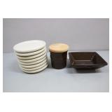 Longaberger Brown Tasting Bowl, Brown Crock With Lid, Eight Coasters