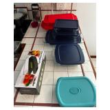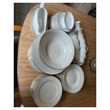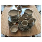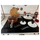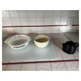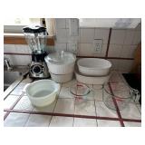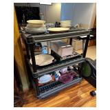 Kitchen Dining table with 4 rolling chairs, Noritake Stoneware dish set, Royal Aurum China set, Pyrex, T Fal, Copper Chef, Oster Blender