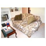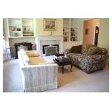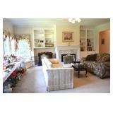 Living Room: Loveseat, Sofa, Coffee Table, Large Antique Ornate Carved Sideboard, Books, Lamps, Art, Smalls, Accessories, and More.