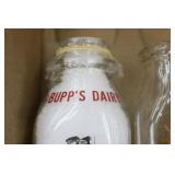 Milk Bottles: (3) Feesers Dairy 1967 Calanders, Pensupreme Receipt Pad, Pensupreme Milk Box, (3) Half Gallon Milk Bottle Crates w/Glass Milk Bottles, (23) Quart Milk Bottle Crates w/Glass Milk Bottles, (5) Supreme Dairy Shippensburg PA Half Pint Glass Milk Bottles, (3) Pensupreme Glass Milk Bottles, (3) Bupps Dairy Glass Milk Bottles, (1) Feeser Glass Milk Bottle, (2) Rutlers Dairy Glass Milk Bottles, (1) Greens Dairy Glass Milk Bottle, (2) Harrisburg Dairies Sweet Arrow Springs Water Boxes w/Bottles, and Other