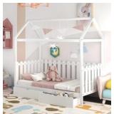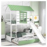 INCOMPLETE -Wooden House Bunk Bed with Trundle, Twin Over Twin Bed Frame with Roof,Window,Convertible Slide,Ladder and Full-Length Guardrail for Bedroom (White+Green)