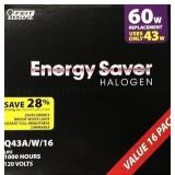 Item Is New And Refundable Only Before The Item Leaves The Building AND If Different Than Described. MSRP: $68 QTY 6 Light Bulb, Halogen, Clear, 43W43w = 60 w. Save 28% in energy use compared to a 60 watt bulb. Saves energy. Bright white light. Instant full brightness. Dimmable. Energy Saver Halogen: Halogen technology helps save energy. Uses 28% less energy then a standard incandescent bulb with equivalent light output. Standard Incandescent: Original technology used to provide light by heating a filament. Average Life: 1500 hours. Lighting Facts per bulb: Brightness: 750 lumens. Estimated yearly energy cost: $4.75 based on 3 hrs/day, 11 cents/kWh. Cost depends on rates and use. Life: Based on 3 hrs/day: 0.91 years. Light Appearance Warm: 3000 K. Energy Used: 43 watts. Compliant with 2012 energy regulations.