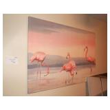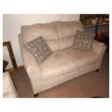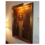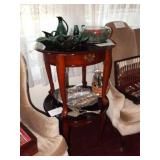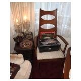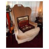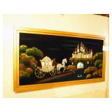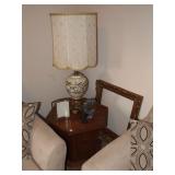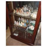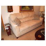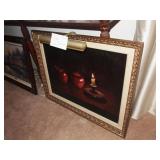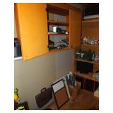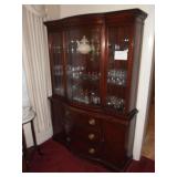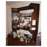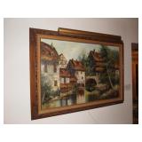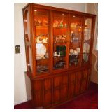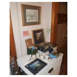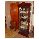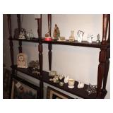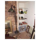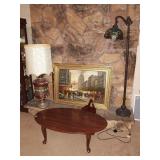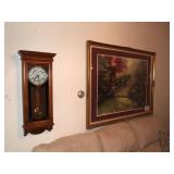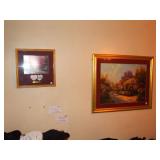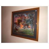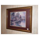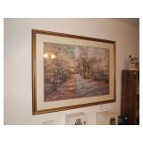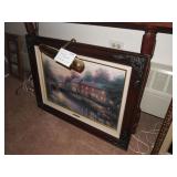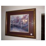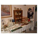 Family Room Mid-century cabinet (needs work) 10-foot tall lighted wood shelves Maple and glass lighted display cabinet (matches cabinet in garage) 2 maple oval coffee tables Vintage octagon-shaped end table Beige UltraSuede sofa and love seat Beige velour armchair Thomas Kinkade framed art "Lamplight Inn" Waterside with ducks Very large piece of garden steps, 383/1350 K. Franke Framed art of a canal and houses Framed signed art of apples and a candle Large framed art, road in the Fall Large framed painting, street scene in evening