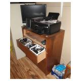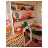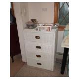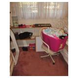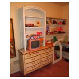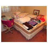 Girl's Bedroom Full-size bed with white wicker headboard, mattress and box spring French Provincial dresser, white with gold accents. Has attached white bookshelf which does not match the dresser. Large white pressed wood 2-door storage cabinet White wicker wall mirror Plastic framed mirror Very small wood table, folds up Framed art of dog by S.P. Hamrick, 712/4000 Framed art of Jesus and angels Pink and purple Disney TV Snoopy telephone/light Women's clothing, size 2XL including dresses, blouses, robes Some children's clothing Bed pillows Assorted health and beauty items