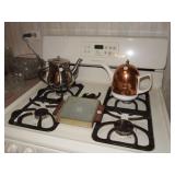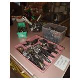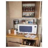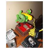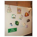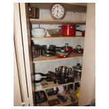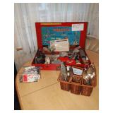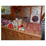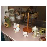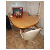 Kitchen Chromcraft light wood oval table with 4 metal and vinyl chairs Thomas Kinkade framed art Vintage erector set, amusement park Assorted pressed glass pieces Glass salt and pepper shakers Dog cookie jar Holly Hobbie Coca-Cola Christmas glasses Walnut Room Christmas glasses Cuisinart red pots and pans Other pots and pans Bakeware Assorted utensils and flatware Panasonic microwave oven Multimix 280 watt hand mixer Hamilton Beach hand mixer Royal toaster 4-slice toaster Toastmaster electric knife Gevalia coffee maker Mr. Coffee 4-cup coffee maker