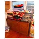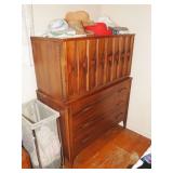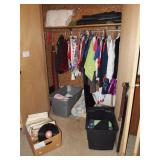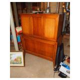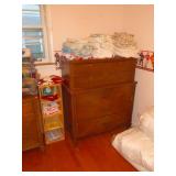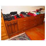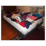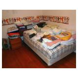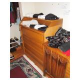 Boy's Bedroom Full-size bed with wood headboard (needs work,) mattress and box spring Stanley bedroom furniture including a tallboy dresser and regular dresser. Both pieces are missing knobs and need work. 2-drawer wood nightstand (matches nightstand in master bedroom) Small white bookshelf Small wood display shelf Towels, sheets, mattress pads Comforters, afghans, cloth napkins Women's clothing, size 2XL
