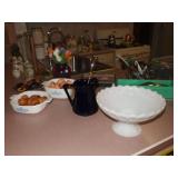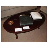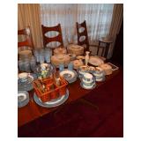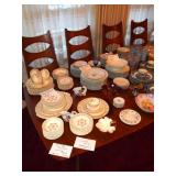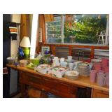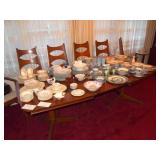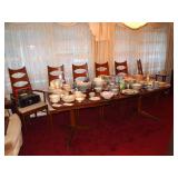 Living/Dining Room Kent Coffey dining room furniture including the dining table with 2 leaves (damage from iron on table top,) 10 dining chairs, china cabinet Drexel china cabinet 2 round wood end tables Vintage wood end table/book rack Plant stand with marble top and wood base 2 beige upholstered wingback chairs Large framed picture of Jesus Sebring Pottery Co., USA Fortune dishes, 63 pieces Noritake "Roanne" china, 34 pieces Royal China Currier & Ives dishes, 43 pieces Aberdeen China "Moss Rose" china, 19 pieces Keystone-Made In USA Canonsburg Pottery Co. dishes, 22 pieces Fransiscan "Maytime" serving pieces Belleek pieces Large selection of glassware Wm. Rogers flatware