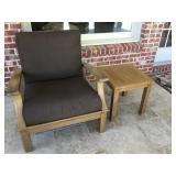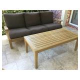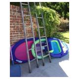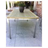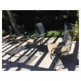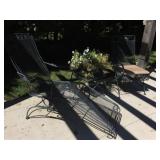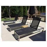 Gloster teak patio furniture: 3 black and chrome reclining chaise lounges Teak & chrome dining table by Gloster Teak sofa & armchair with brown cushions by Gloster Two small Gloster side tables Gloster large teak coffee table Expanded metal adjustable lounge chair, five bounce chairs with cushions, & two side tables from The Patio Shop three pool floats, two decorative ladders, large bell