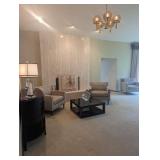 Wool entryway carpet, ocean on canvas painting, Baldwin piano and bench, upholstered arm chair, coffee table, modern by crescent console table, John Bingham art glass, accent lamps, acrylic sculpture, chrome glass unit, tall candle sticks, E. Deshan Lucife shadowbox, animal art decor, cider cabinet, beveled oversized mirror, leather arm chair, Replogle Heirloom Globe lamp, media cabinet, books, cocktail table, antique China cabinet, Ethan Allen chairs, Henredone lounge, Asian framed relief art, silver mirror, Gerber blades set, accent lamps, Waterford glasses, vases, large Jos Rovers abstract landscape picture, brass unicorn, Dantorp candelabra brass, G. Lerin oil on canvas, mid century side table, Heywood Wakefield lounge chair with ottoman, ceramic jar, side table, unicorn porcelain sculpture, Vanguard swivel chair, founders table, Samsung TV, Fire Kung Lotus Gladite plates and bowls, pictures, Italian dresser, Italian king size bed, king comforter and pillows, beautiful lamps, upholstered arm chairs, Ruth Lee art, Lane dresser, cabinet, sewing box with threads, Sentry 5330 safe, folding chairs, elephant sculptures, animal pictures, LOTS of fur coats, Lenox Princess dinnerware, Royal Doulton Sarabarde China set, Ernest Sohn Chafing dish, Mikasa ultra ceram set – Blue Ginger, Headline Ultima by Mikasa set, made in Italy bowls, Cutco knifes set, Hamilton Beach toaster oven, Pyrex bowls, glass punch bowl set, made in USA white and yellow dishes, pots and pans, glasses, flatware, cutlery.