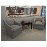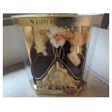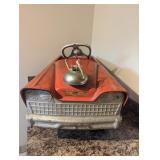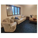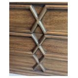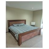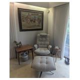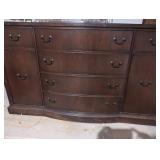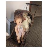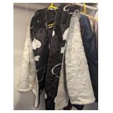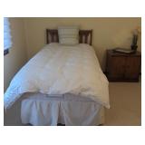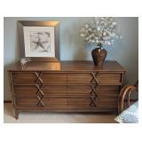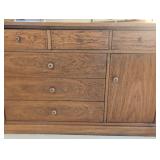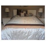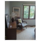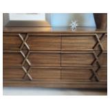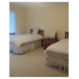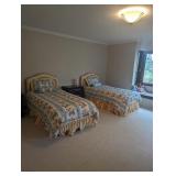 American of Martinsville dresser, queen bed frame and mattress, queen bed comforter and pillows, white nightstands, lamps, Pier One chair, Milo Boughmen lounge chair, woman and men clothing, shoes, MCM twin beds, twin down comforters, two door cabinet, marble top antique table, lamps, nine drawer dresser, trays, heavy acrylic lamps, Seiko clock, twin beds, floral comforter bed skirts and pillows, two drawer nightstand, lamps, side by side door cabinets, pictures, wicker table, Lilliput dollhouse, dolls, stuffed animals, blankets, linens.