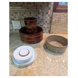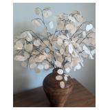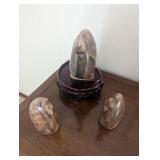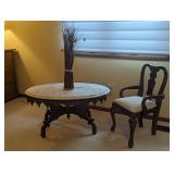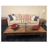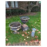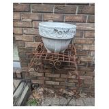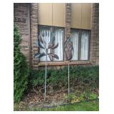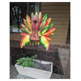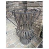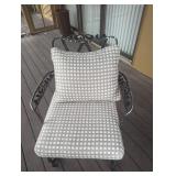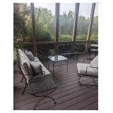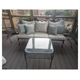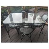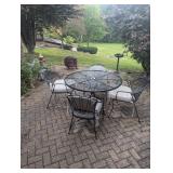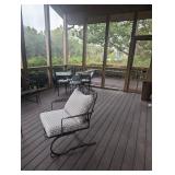 Wrought iron table with glass top, wrought iron sofa, wrought iron chair, wrought iron glider, iron side tables, patio set of four, outdoor cushions, metal bird bath, large wood owl, large outdoor decorations, metal wagon wheels, lounge chair with cushion, Webber BBQ, patio table and 4 chairs, Wrought iron planters, large turkey decorations, outdoor wind spinner