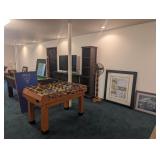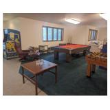 Tall bookshelves, mid century cabinets, secretary desk and chair, Drexel cabinet, white bookshelfs, kids books, toys, games, accent chair, Thayer Coggin leather chairs, side table, burgundy chair and ottoman, upholstered bench, La Z Boy swivel chair, Centum ivory sofas, accent pillows, coffee table, side tables, accent lamps, pictures, mirrors, Samsung TV, bookshelves, fan, large art decor, Pingpong table, Pac-Man machine, Gandy pool table, pool cue stick corner rack, Bumper pool table, Football table, Sunny treadmill, Schwinn bike, Caloi bike, China cabinet, desk, buffet, Bakers rack hutch, four drawers dresser, side tables, Hall tree with mirror, swivel chairs, coffee, rugs, Henredon accent arm chairs, faux tree, metal cabinet, bookshelf divider, Bumbleride double stroller, cabinets, dresser, office chair, Laura Ashley mattress, Queen frame and headboard, Antique canopy bed, nightstands, Sealy mattress, metal shelves, Braun, coffee maker, Cuisinart double wall thermal carafe, humidifier, stools, Schwinn Ardyne machine, RugDoctor carpet cleaner, plastic shelves, tools, Craftsman 13″ Drill Press, Ryobi machine, Cadi with casters, ladders, Craftsman router and more.