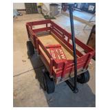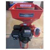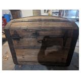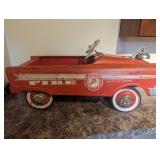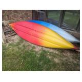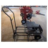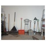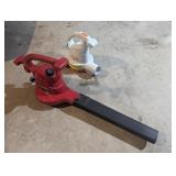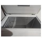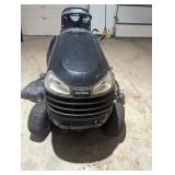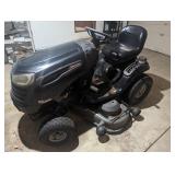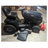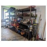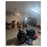 Craftsman riding lawnmower, Predator wood chipper, Ridgid wet dry vac, chainsaw, Ryobi metal detector, leaf blower, ATW cargo wagon, electric air compressor, battery charger, tripod, metal ladder, snow shovels, vintage trunk, Frigidaire freezer, fire pedal truck, Perception Sport kayak, eight drawer dresser, metal and plastic shelves, gardening tools, step stool, metal cart, dog crate.