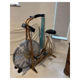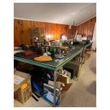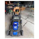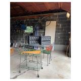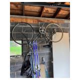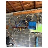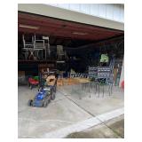 Garage: bistro set, kobalt 80 V electric lawnmower with batteries, vintage bikes, patio table and chair set, lawn and garden tools