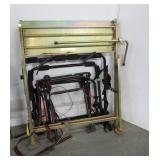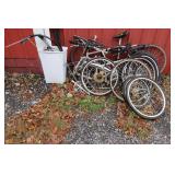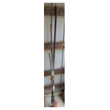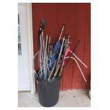 Trash Barrel With Boat Canopy Frame Parts, Snow Ski Poles, Baseball Bats