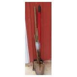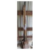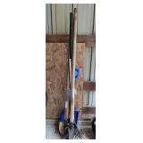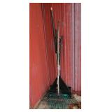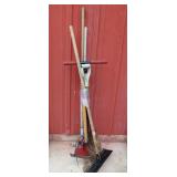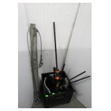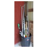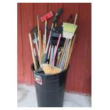 Plastic Barrel With Numerous Broom Handles, Brooms, Electric String Trimmer and Hedge Trimmer