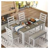 This 6-piece dining room set full of country-chic charm, this beautifully distressed set makes a stylish statement. The lovingly worn finish matches perfectly with contemporary, farmhouse or coastal chic decor. The tabletop is made of solid wood veneer, and the distressed finish traces highlight the retro feeling and country style.