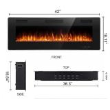 Overall dimensions: 42” x 18.11” x 3.86”. Multiple Install Methods:This electric fireplace not only can be Recessed or semi recessed in wall but also can be Wall Mounted, This 42-inch-wide electric fireplace only weighs 42.9pounds, so one person can easily hang it on the wall using the step-by-step instructions provided. Once it has been mounted to your wall, all you need to do is hang and secure your fireplace with the drywall screws. Realistic Flame Effects:Ultra High Intensity Led lights with large display allows the flame to "burn" high enough. THERMOSTAT and ENERGY SAVINGS: Front heater blower, 750W & 1500W modes can be adjusted accordingly for both warm and energy saving purpose. The supplemental zone heating is for up to 400 square feet. Flexible Control Modes:Remote and touch screen make it more convenient to control every function of electric fireplace.