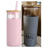 Lot-Of-2 KLG GOODS 20 oz. Glass Tumbler with Straw, Bamboo Lid, and Silicone Protective Sleeve - Pink, Grey