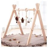 RAZEE Wooden Baby Play Gym Play Mat, Baby Gym with 6 Hanging Sensory Toys