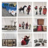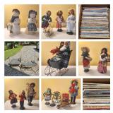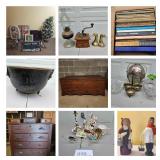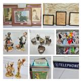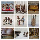 This downsizing features several Byers' Choice Carolers, vinyl records, and lots of vintage prints. Some nice older furniture including a true brass bed, a Hinkle-Harris bed frame, some old steamer trucks and chests, a very cool old telephone sign, and much more.