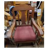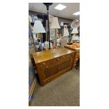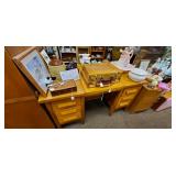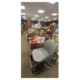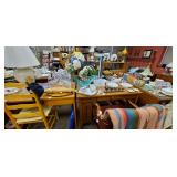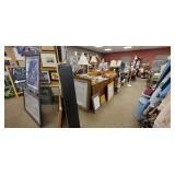 A hand crafted drop leaf table. We have 2 sets of 4 matching chairs, 2 beautiful shelving units, computer desk, table and floor lamps, piano stool, quilt racks both hanging and floor standing. We have a lit glass curio cabinet cherry wood look with glass side access, A small half octagon lit curio cabinet, several desks including a vintage 6 drawer desk that has hidden typewriter storage that would also work for a laptop computer! We have a A beautiful antique Victor Victrola Vintage Mahogany Talking Machine Phonograph, a music cabinet, a small maple finish round dining table with 2 leaves. A vintage room screen, Burlwood/driftwood table lamp, vintage wooden picture frames that are large enough to dress up any simple mirror to give it a new look. Several vintage magazine racks. Child rocking chair. We have a variety of rugs from runners to room size. Vintage wooden high chair. Side chairs and desk or craft chairs. A beautiful antique mahogany veneered buffet with Bakelite handles, an antique cast iron and wood wall shelf, 2 wood window 9 pane frames just ready to add glass and your family photos or travel photos or a view that you would love to see outside your window! 2 vintage 1950's metal TV trays. A beautiful black and gray stylish century brand couch, A green wing back chair and a great club chair. We have a very comfortable La-z-boy love seat!