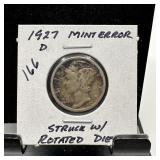 1927-D MERCURY SILVER DIME STRUCK W ROTATED DIES |