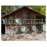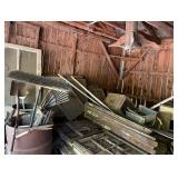 Corner Contents of Barn Including 55 Gallon Drums with Tools, Vintage Windows, Ladders, Wood and More