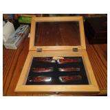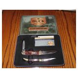 KINVES & OUTDOOR: Buck 110x w/ Sheath; Throwing Knives; Buck Smidgen Knives x5; Buck 110; Benchmade Elishewitz ATS-34; US M8A1 Bayonet; US M4 Bayonet; Camillus USMC Knife; Old Timer Skinner; Ka-Bar Skinning Knife; Gerber Dagger; Home Oil Co Chapman KS; Renegade Red Head & Saddle Horn 2 Blade; Frost Bone Trapper; Buck Shot Spring Assist; Wartech USA Knives x5; EC Simmons Saddle horn & Toothpick; Frost Sport Folder x2; Elite Edge x2; Chipaway Little Chipmunk; Chipaway Handmade Knives x3 w/ Sheath; Ruger Knife; Case XX 300 L; Case SS Steel Knife; Winchester Limited Edition 2006 & 2008 3 Knife Set; Buck 389 Canoe & 385 Toothpick Set; Buck 379 Solo & 373 Trio Set; Colt Bone Handled Knife; Remington Limited Edition 2007 Sportsman Set; Buck Centennial Collectible W/ Wooden Case; Winchester Knives x7; Ocoee River Spring Assist x2; Frost Cutlery x10; Edgemark Brazil 22-508 Bone Handle; Schrade Uncle Henry; Barlow Sabre; Coleman Model 220k Lantern; Black Coleman Lantern; Thermos Lantern; Zebco 33; Zebco Fishing Poles x5; Pearson Wooden Long Bow; Bear Long Bow; Fishing Tackle; Charcoal Grill;