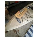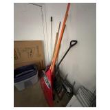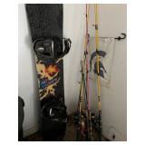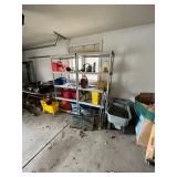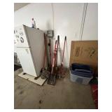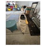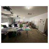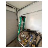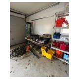 Garage, pelican kayak garden tools, Kirkland refrigerator, basketball hoop, Black & Decker, weed husky toolbox, ladders, camping chairs, cooler, fishing poles, snowboard, sports attire