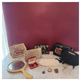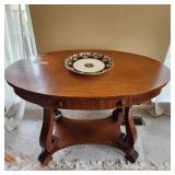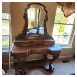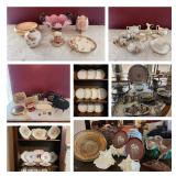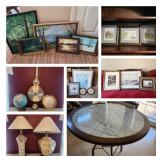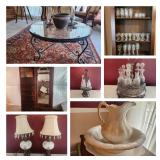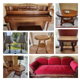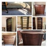 This estate features furniture from Skandia, Penns House and Drexel. Curved curio cabinet, tables, baker's rack, vintage chairs, bookcases, mirrors. Assorted glassware, milkglass lamps, Wedgwood, Limoge, and even some baseball cards. Enjoy!