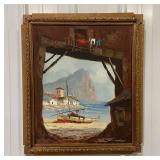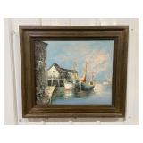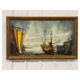 Joseph Brocken Original Framed Oil On Canvas Painting of Ships In A Harbor, Signed By Artist With Note of Authenticity Signed By Artist Taped On